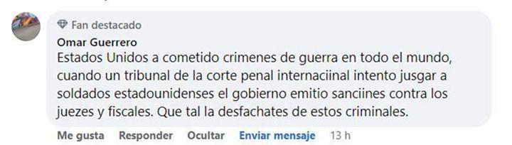 委内瑞拉网友奥马尔·格雷罗说,美国在世界各地犯下战争罪行,但若国际法庭想要审判美国军人,美国就会对法官和检察官施加制裁,可谓厚颜无耻。