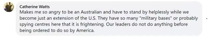 澳大利亚网友凯瑟琳·沃茨说,无助地看着美国的所作所为实在令人愤慨,而美国在澳大利亚设立很多军事基地或情报机构,这一点令人恐惧。