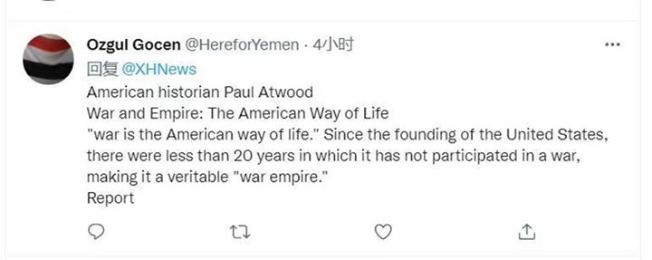 英国网友厄兹居尔·格琴对报告中援引的一段话很有共鸣:美国历史学家保罗·阿特伍德在2010年出版的《战争与帝国:美国的生活方式》一书中指出,“战争是美国人的生活方式。”美国自建国以来,没有参加战争的时间不足20年,是一个名副其实的“战争帝国”。