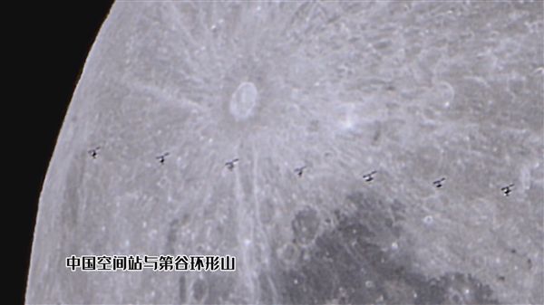 在8K相机拍摄的画面中,可以清晰地看到中国空间站的天和核心舱、问天实验舱组成的“土”字型结构,还有与月球表面静海、第谷环形山等区域的合影。