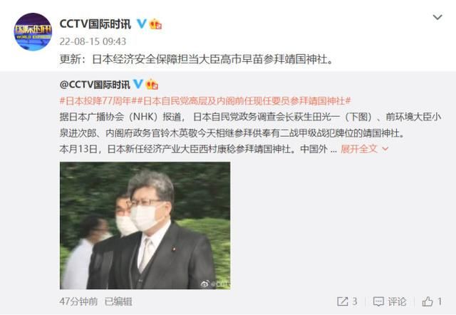 据日本广播协会(NHK)报道,日本经济安全保障担当大臣高市早苗参拜靖国神社。日本自民党政务调查会长萩生田光一、前环境大臣小泉进次郎、内阁府政务官铃木英敬今天相继参拜供奉有二战甲级战犯牌位的靖国神社。