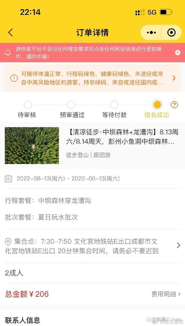 8 月11日周四,张继购买了8月13日周六“中坝森林+龙漕沟”的出游。APP描述该路线称,从成都出发,到彭州小鱼洞中坝村,开始徒步,“打卡小红书网红 森林”,然后沿小路下到龙漕沟,“找一个清澈的水潭,大家一起来一场湿身大战。”按照行程单,14日周日将有另一批游客行走同一路线。