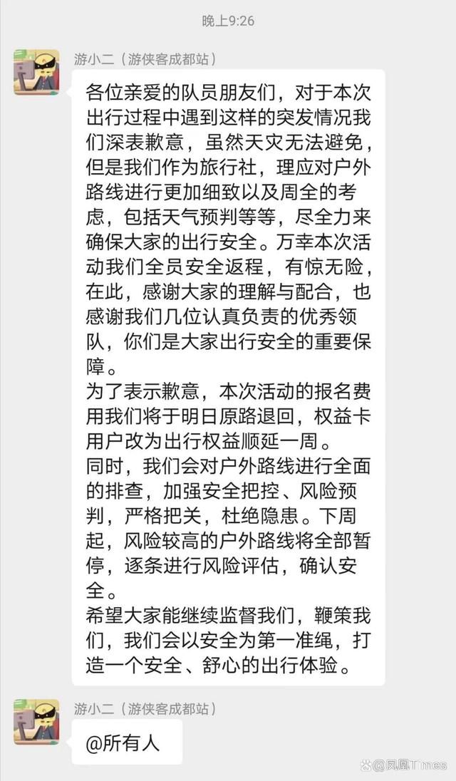 14日晚21:26,游侠客成都分公司的一名工作人员在群里发了一则声明,称将为本次所有团友退费,“同时,我们会对户外路线进行全面的排查,加强安全把控、风险预判,严格把关,杜绝隐患。下周起,风险较高的户外路线将全部暂停,逐条进行风险评估,确认安全。”