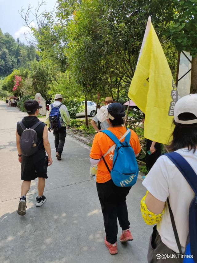 下午1点半,旅行团从中坝森林出发,沿着一条小路走了6公里,到龙门山镇龙漕沟。2点到3点半的一个半小时中,旅行团的100多人在河里玩水。当天,这条河聚集了大量游客,旅行团给大家安排在上游一处人少的河道。团友们都戴着游侠客配发的黄色速干头巾,标志明显。