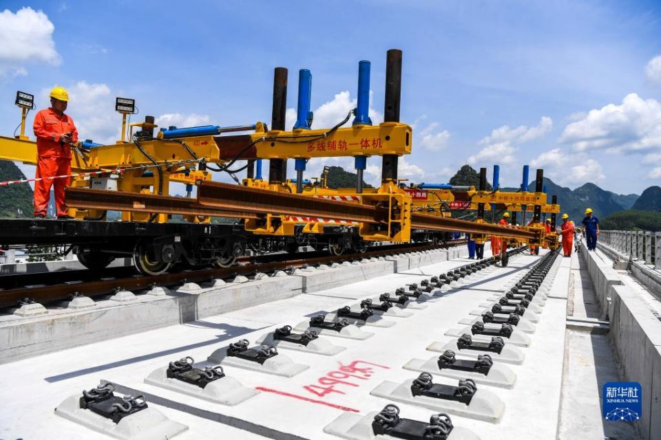 首页 贵南高铁全线开始铺轨 2022-08-17 08:40:15 分享 这是8月16日拍摄的贵南高铁广西段龙江双线特大桥铺轨作业现场。当日,在广西河池市,一台铺轨机将一段500米长钢轨铺设在贵南高铁龙江双线特大桥的无砟道床上,标志着贵南高铁正式进入铺轨阶段。建设中的贵南高铁是我国“八纵八横”高速铁路主通道包头至海口通道的重要组成部分,设计时速350公里。新华社记者 曹祎铭 摄