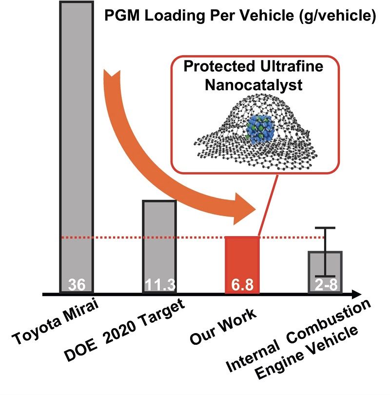 与DOE催化剂标准相比,石墨烯包裹合金产生了非凡的结果:催化活性提高75倍;功率提高65%;在燃料电池预期寿命结束时,催化活性提高约20%;在模 拟使用6000—7000小时后,功率损失降低了约35%,首次超过了5000小时的目标;每辆车所需的铂金几乎减少了40%。