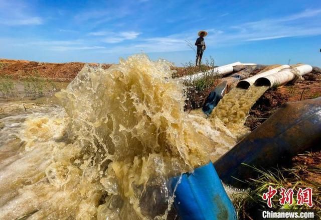 江西省九江市都昌县周溪镇枭阳10号附坝,抽水泵在鄱阳湖取水,经过三级提灌,为坝内五千亩稻田灌溉保苗。傅建斌 摄