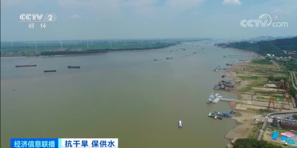 目前,鄱阳湖水位仍在持续下降,在鄱阳湖入长江口,往日宽阔的湖面上出现大片黄色滩涂,航道变得狭窄。