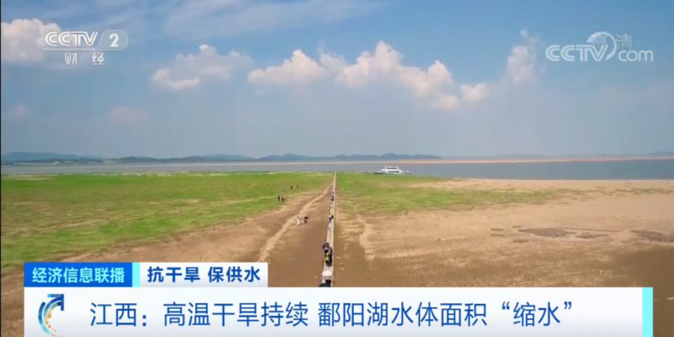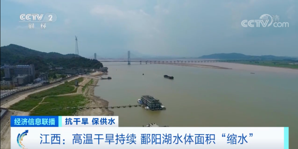 受持续高温影响,我国最大淡水湖,江西鄱阳湖的水位持续走低。截止到17日8点,长江湖口站水位和鄱阳湖星子站水位均比往年偏低6米多。