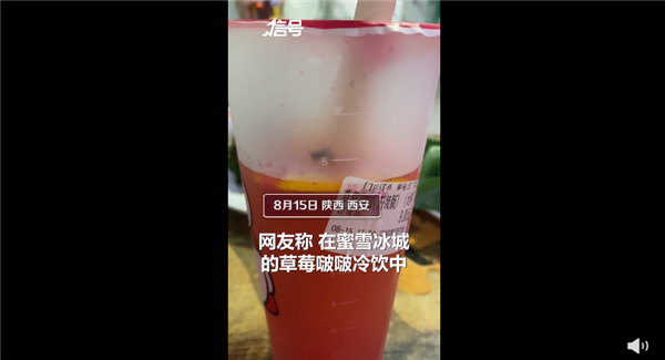 8月15日,陕西西安有网友称在蜜雪冰城的草莓啵啵冷饮中喝出一只苍蝇,发现时苍蝇还在杯中爬来爬去,十分吓人。