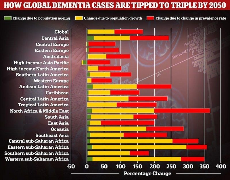 华盛顿大学医学院的研究表明,到2050年,全球阿尔茨海默病例将增加近3倍,从5740万例增至1.528亿例。但不同地区发病率会有所不同:西欧病例预计增加75%、北美病例预计增加一倍、北非和中东则预计将增加375%。