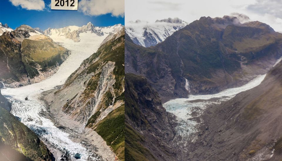 这张拼版图片显示的是2012年时的福克斯冰川全貌(左)和2021年4月19日航拍的福克斯冰川(右)。福克斯冰川是新西兰南岛南阿尔卑斯山山脉重要的冰川,是新西兰著名旅游胜地。由于全球气候变暖,福克斯冰川过去十年大幅退化。(新华社记者郭磊摄)