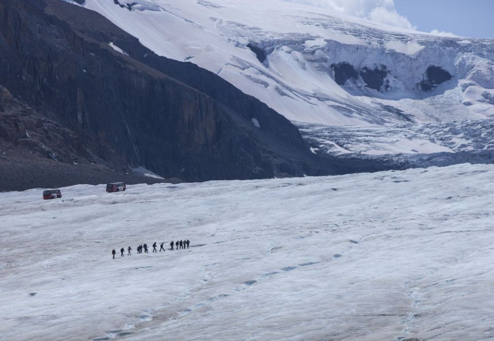 这是2018年7月24日,游人在加拿大落基山脉贾斯珀国家公园的阿萨巴斯卡冰川上行走。新华社发(邹峥摄)