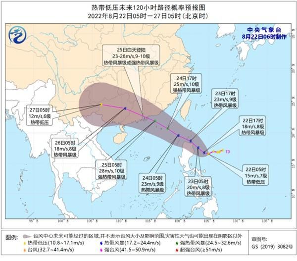 预计,低 压中心将先以每小时7-10公里的速度向偏西方向移动,22日傍晚以后将转向西北方向移动,并将于22日加强为今年第9号台风。随后将于24日凌晨移入南 海东北部海面,逐渐向广东沿海靠近,强度继续增强,最强可达强热带风暴级(10-11级,25-30米/秒),并将于25日白天在上述沿海登陆 (23-28米/秒,9-10级,热带风暴级或强热带风暴级)。登陆后,强度逐渐减弱。