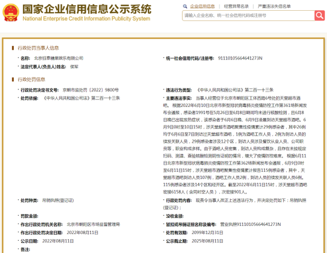首页 北京天堂超市酒吧执照被吊销 2022-08-23 10:44:13 分享 国家企业信用信息公示系统显示,北京天堂超市酒吧经营者——北京钰泰糖果娱乐有限公司,被北京市朝阳区市场监督管理局依法处以吊销执照(登记证)处罚。来源:国家企业信用信息公示系统编辑:高珊珊流程编辑:郭丹