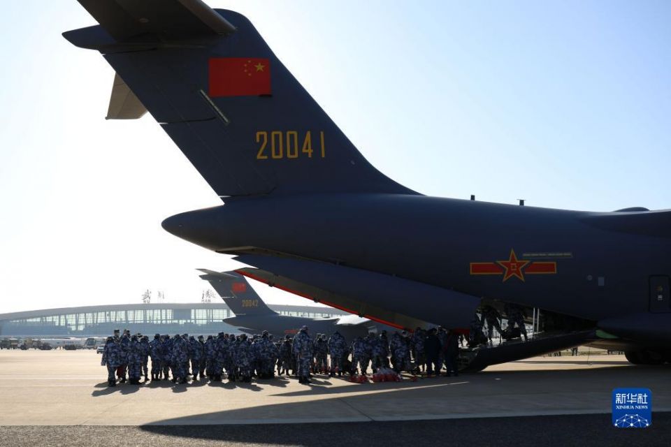 中部战区空军航空兵某团运-20飞机满载军队医疗队人员和物资抵达武汉天河机场(2020年2月17日摄)。新华社发(龙德勇 摄)