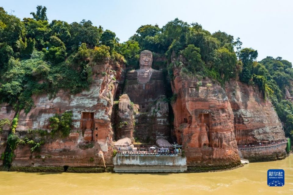 首页 四川乐山大佛露出底座 2022-08-24 09:10:38 分享 这是8月23日拍摄的露出底座的乐山大佛(无人机照片)。近期,持续高温晴热天气使四川省多地出现不同程度的旱情,长江上游的主要支流岷江、青衣江和大渡河三条水系的上游来水均少于往年同期,导致乐山大佛前方的三江汇流处水位持续降低,部分河床与江滩裸露,乐山大佛罕见露出底座。新华社记者 沈伯韩 摄
