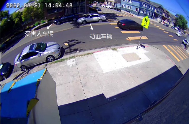 劫匪驾驶白车,靠近受害人停在路边的黑车。(监控录像截图)