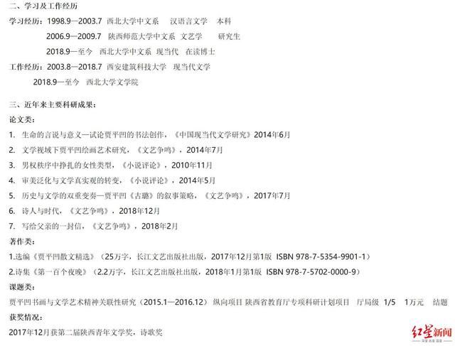 ↑贾浅浅个人履历及作品,图据西北大学官网
