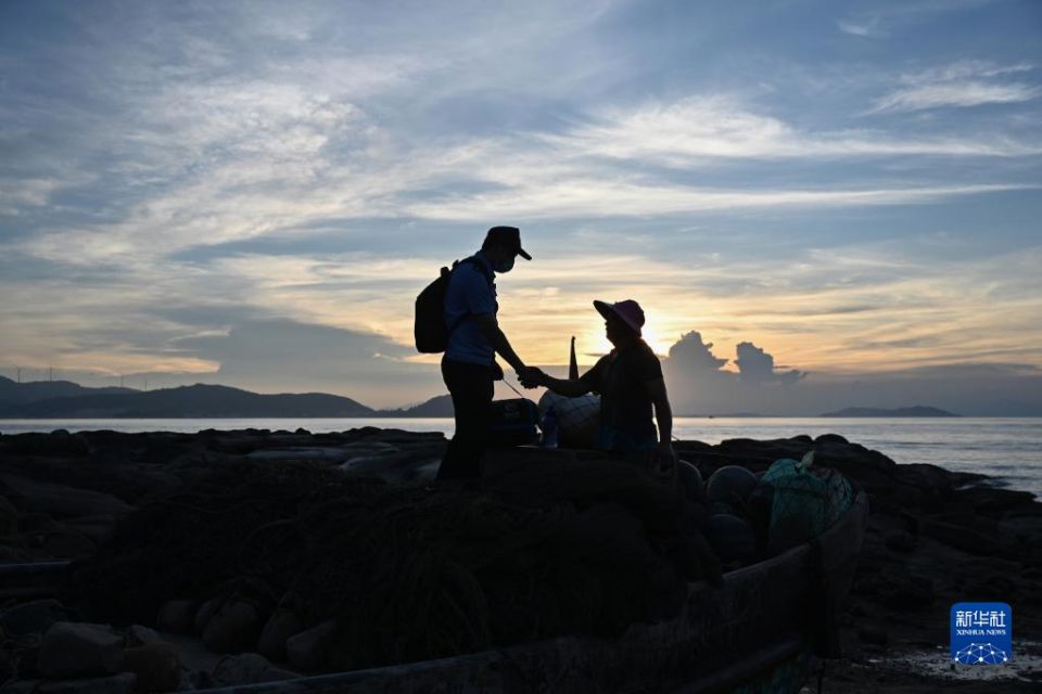 8月23日,在莆田市秀屿区埭头镇黄瓜村,渔民主动与许伟伟(左)握手。在黄瓜岛,许伟伟对村民来说如同家人一样,他们每次见到许伟伟,都会向他打招呼。