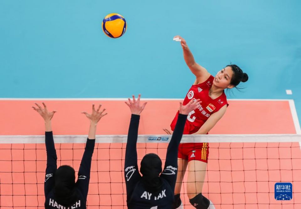 8月25日,中国队球员王逸凡(上)在比赛中扣球。新华社发(乌马利摄)