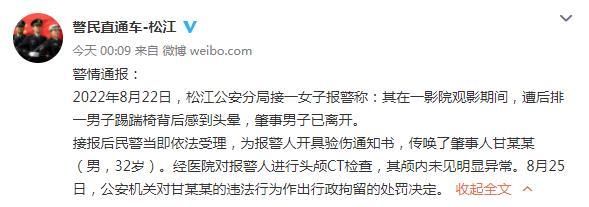 8月26日,据海市公安局松江分局官方微博@警民直通车-松江 就此事发布通报称,2022年8月22日,松江公安分局接一女子报警称:其在一影院观影期间,遭后排一男子踢踹椅背后感到头晕,肇事男子已离开。