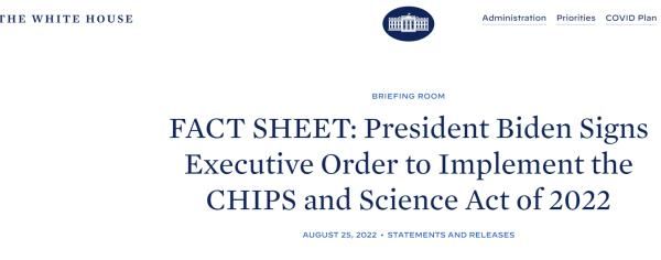 就在十几天前,拜登8月9日将《芯片和科学法案》签署成法律,他当时在法案签署仪式上的讲话中多次明确提到中国。该法案向在美国的芯片制造企业提供巨额补贴的同时,要求这些企业必须同意“不在中国发展精密芯片的制造”。