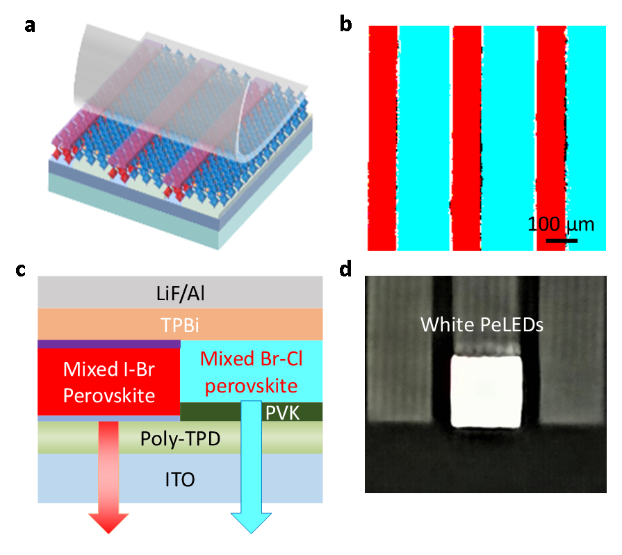 基于此,肖正国教授课题组使用表面能很低的聚二甲基硅氧烷PDMS衬底进行钙钛矿薄膜和微纳结构的巨量转移。在不改变钙钛矿薄膜的表面形貌、成分和光电性能的前提下,成功将钙钛矿薄膜转移到柔性衬底上。在器件制备过程中,使用一层超薄的支化聚乙烯亚胺作为钙钛矿与传输层之间的化学结合层,能大大增强转移器件界面处的电接触。膜转移方法制备的钙钛矿发光二极管具有与优化的旋涂器件相同的外量子效率。另外,使用该方法还能够制备分高辨率、大面积钙钛矿微纳结构。在此基础上,通过将红光钙钛矿条纹与天蓝光钙钛矿条纹交替排列,成功制备出了白光钙钛矿发光二极管 。