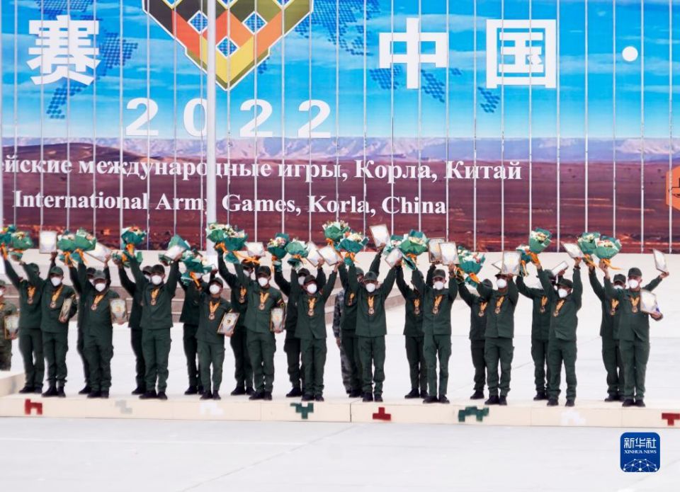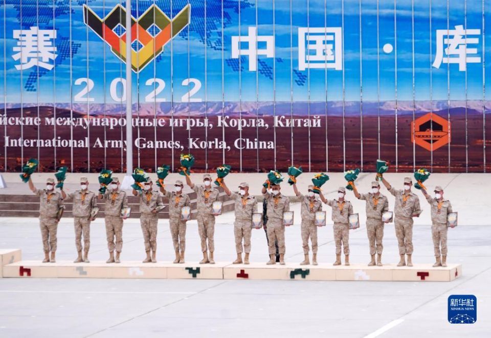 8月26日,“国际军事比赛-2022”中国库尔勒赛区举行闭幕式。这是中国参赛队员站在领奖台上。新华社发(罗兴仓 摄)