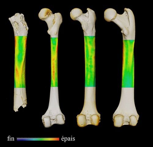 图中从左到右依次是沙赫人、现存人类、黑猩猩和大猩猩的股骨3D皮质厚度变化图。图片来源:《自然》