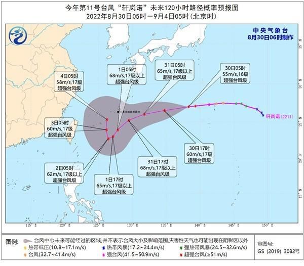 预计,“轩岚诺”将以每小时30公里左右的速度向偏西方向移动,强度继续加强,最强可达超强台风级(58-65米/秒,17级及以上),并逐渐向琉球群岛南部海域靠近,将于31日白天开始影响我国东部海域。