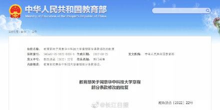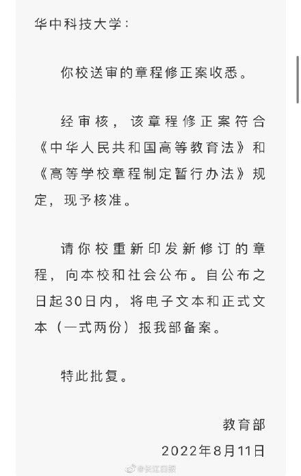 (31日),教育部网站公布 《教育部关于同意华中科技大学章程部分条款修改的批复》。在《华中科技大学章程修正案 (2022年核准稿)》中提到将第二条修改为:“学校名称为华中科技大学,简称华中大、华科大,英文名称为Huazhong University of Science and Technology,简称HUST,由原华中理工大学、同济医科大学、武汉城市建设学院于2000年合并组建而成。学校法定注册地为湖北省武汉市洪山区 珞喻路1037号。学校同济校区地址为湖北省武汉市硚口区航空路13号;国际医学中心地址为湖北省武汉市东湖新技术开发区群英路66号。”(来源教育部网 站)