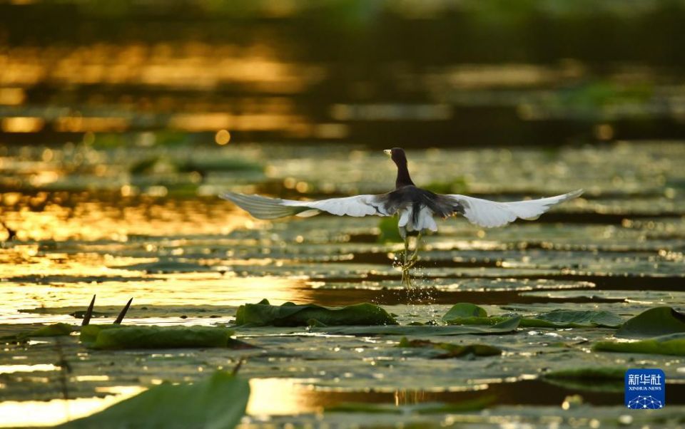 首页 诗意中国——翻空白鸟时时见,照水红蕖细细香 2022-09-05 08:33:46 分享 8月23日,在河北省沧县纸房头镇大白洋桥三村的荷园里,水鸟在荷叶间“翩翩起舞”。初秋时节,暑热消退,荷塘中暗香浮动,水鸟飞舞,充满诗情画意。新华社发(苑立伟摄)