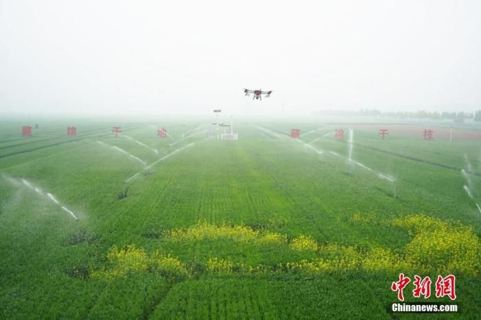 资料图:河南开封,尉氏县张市镇的万亩高标准农田示范区里,植保无人机在麦田上空工作。 中新社记者 韩章云 摄