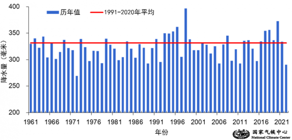 图4 6月1日至8月31日全国平均降水量历年变化(1961年-2022年)