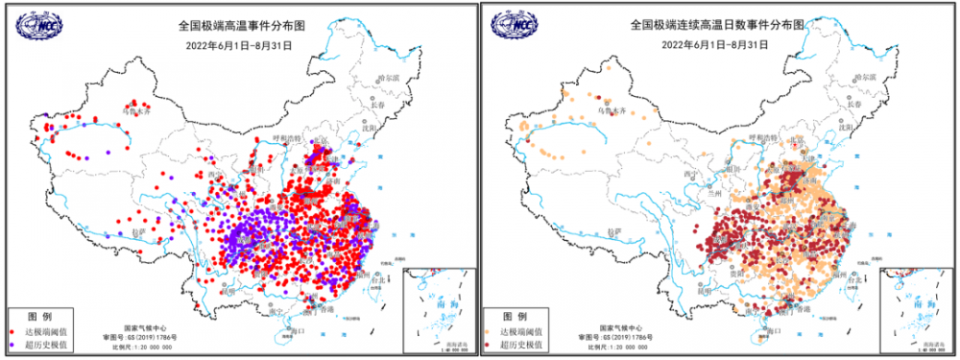 图3 2022年夏季全国极端高温(左)及极端连续高温日数事件(右)分布