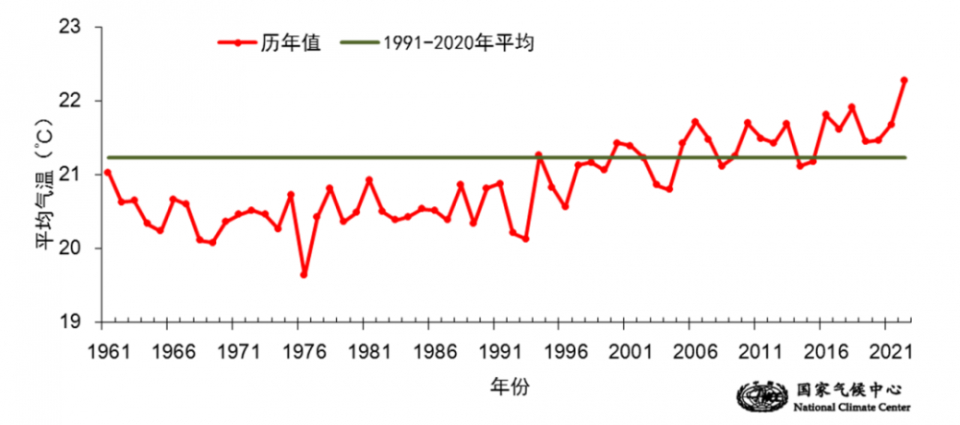 图1 6月1日至8月31日全国平均气温历年变化(1961年-2022年)