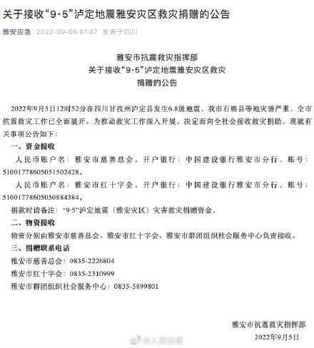 人民币账户名:雅安市慈善总会,开户银行:中国建设银行雅安市分行,账号:51001778605051502428。