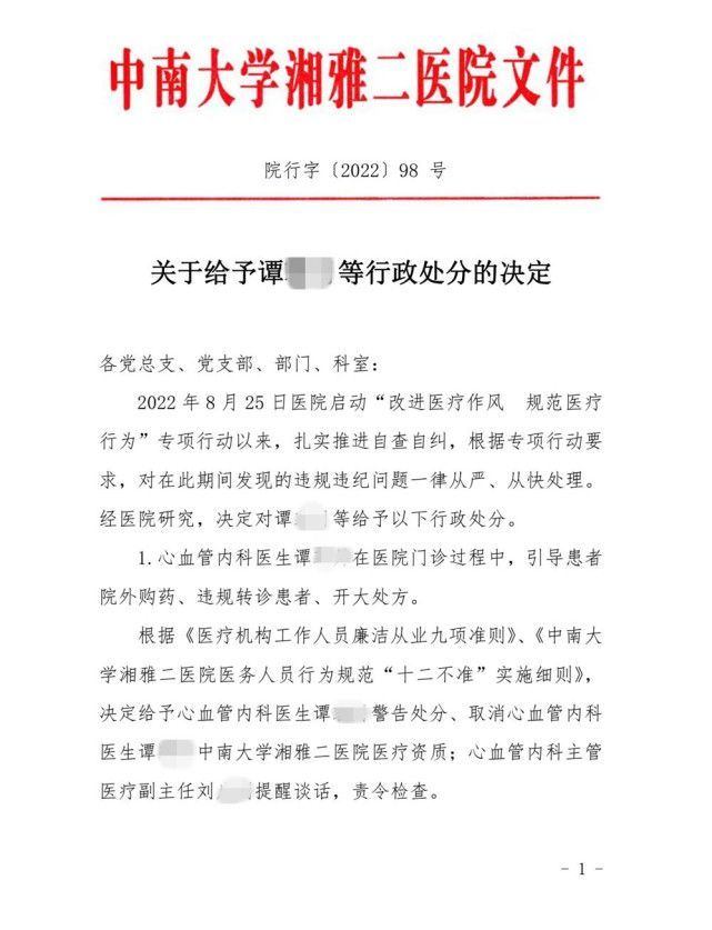 《决定》称,心血管内科医生谭某某在医院门诊过程中,引导患者院外购药,违规转诊患者、开大处方。根据《医疗机构工作人员廉洁从业九项准则》《中南大学湘雅二医院医院医务工作人员行为规范“十二不准”实施细则》,决定给予谭某某警告处分、取消谭某某中南大学湘雅二医院医疗资质;心血管内科主管医疗副主任刘某某提醒谈话,责令检查。