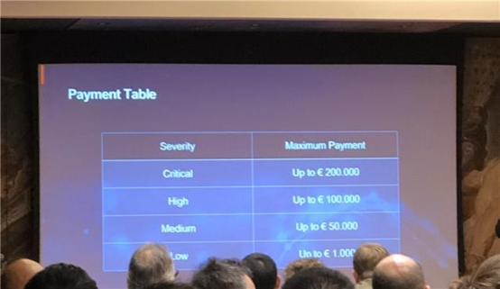 原创内容 传华为推出手机漏洞悬赏计划 最高奖赏为20万欧元 2019-11-17 09:27:09 分享 炣燃科技11月17日讯 11月17日,据Twitter知名博主Azeria透露的消息显示,华为于在慕尼黑举行会议正式推出了“手机漏洞悬赏计划”,会上邀请了业内最出名的移动终端研究人员及黑客等人员,按照华为的计划,漏洞悬赏旨在向其他政府表明其愿意与黑客和安全研究人员合作以增强其产品的安全性,从而打消其他国家对华为设备安全性的担忧。《炣燃科技》根据博主Azeria发布的现场图片发现,针对找出漏洞的人员,华为方面共给出了4档资金奖励,分别是20万欧元、10万欧元、5万欧元和1000欧元。