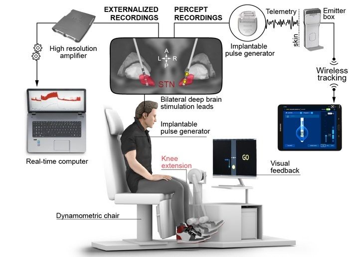神经机器人平台的示意图,该平台研究在舒适和良好控制的条件下腿部肌肉激活的编码。患者进行膝关节伸展等运动,该装置记录肌肉激活和来自丘脑下核(STN)的信号。