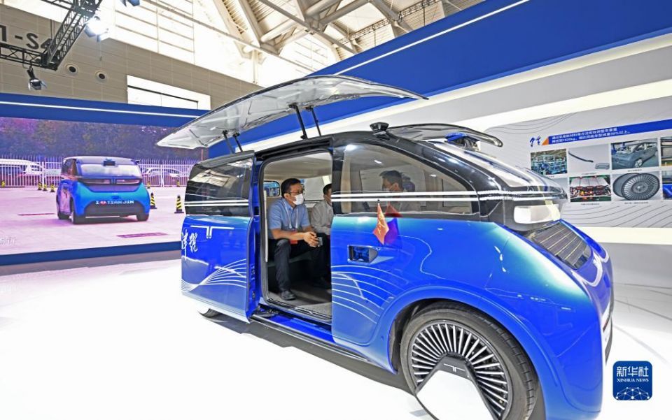 在第六届世界智能大会天津制造业立市展上,参会嘉宾体验“天津号”纯太阳能汽车(2022年6月24日摄)。新华社记者 赵子硕 摄