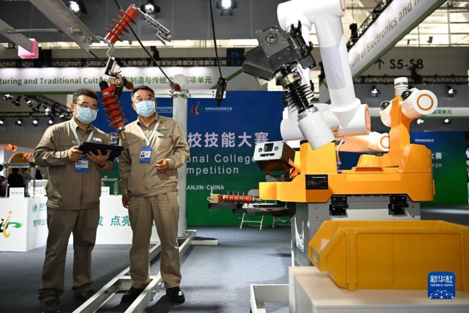 在国家会展中心(天津),工作人员在首届世界职业院校技能大赛上操作演示人工智能配网带电作业机器人(2022年8月19日摄)。新华社记者 孙凡越 摄