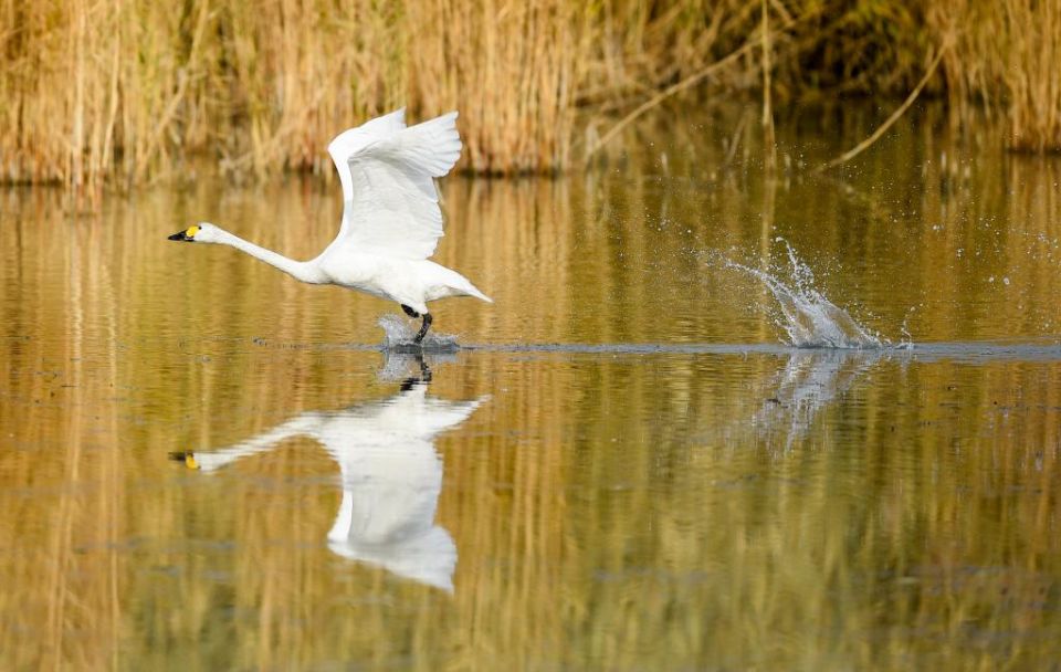 天鹅在乌梁素海水面上嬉戏(2020年10月28日摄)。新华社记者 连振 摄