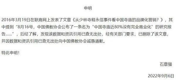 经查,我会从未发布过类似报告或统计数据。相关作者已于近日发表公开致歉声明,承认“该数据和资讯引用查无出处”并向中国佛教协会诚恳致歉。