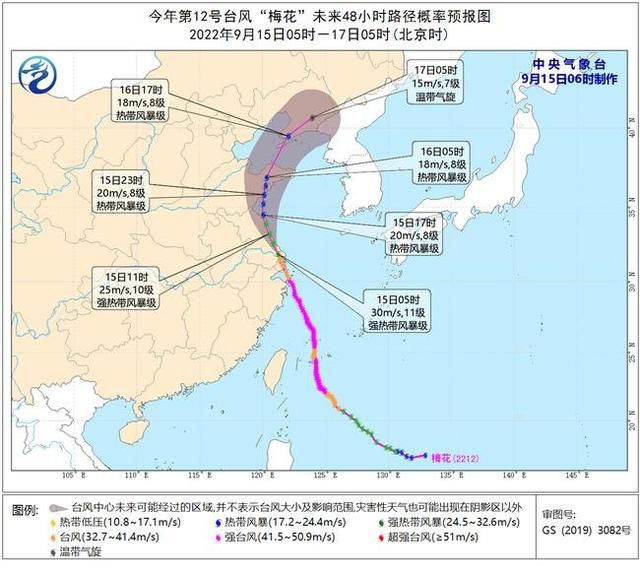 预 计,“梅花”将以每小时25-30公里的速度向北偏西方向移动,今天白天自南向北穿过江苏东部沿海,将于今天傍晚前后从江苏盐城附近移入黄海南部海面,并 将于今天夜间在山东半岛南部沿海再次登陆(热带风暴级,20-23米/秒,8-9级),以后逐渐转向北偏东方向,穿过山东半岛后,将于16日白天移入渤海 海峡,并逐渐变性为温带气旋。