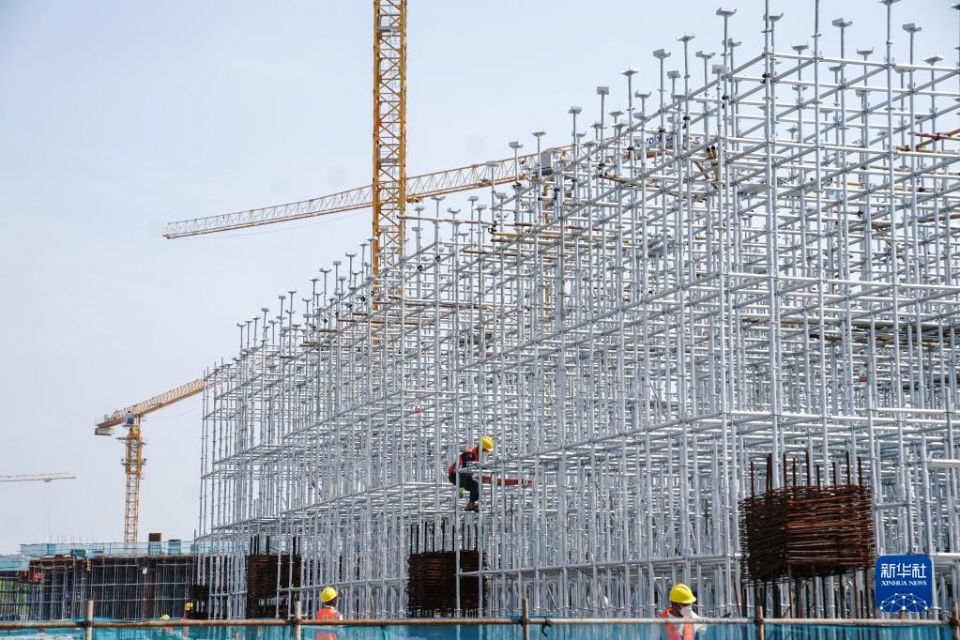 中建三局华东公司上海分公司的工人在位于上海的华为青浦研发中心项目工地上作业(2022年6月15日摄)。新华社记者 丁汀 摄