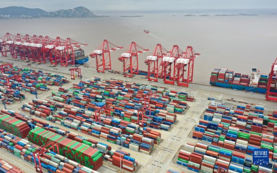 这是上海洋山港集装箱码头(2022年4月15日摄,无人机照片)。新华社记者 丁汀 摄