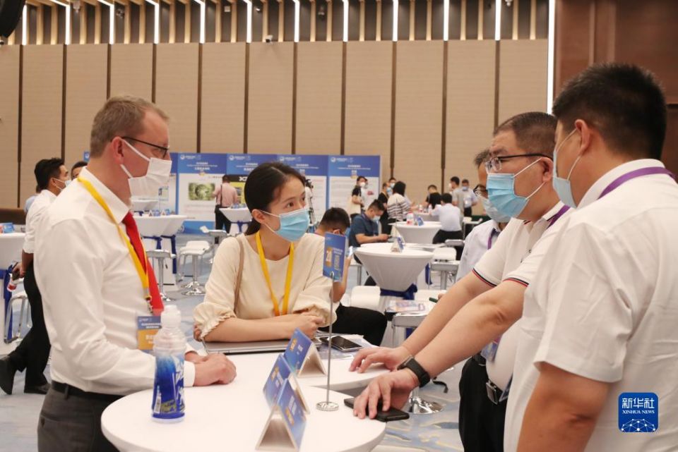 第五届进博会技术装备展区展前供需对接会在上海举行。这是参展商代表(前左二)在对接会上向采购商介绍企业产品情况(2022年8月8日摄)。新华社记者 方喆 摄