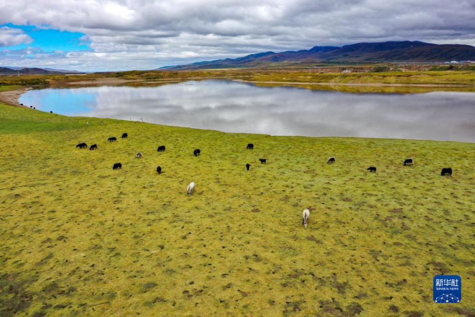 牛群和马在黄河玛曲段干流沿岸的一处草地上吃草(9月17日摄,无人机照片)。玛曲县在2019年就实现了草畜平衡。